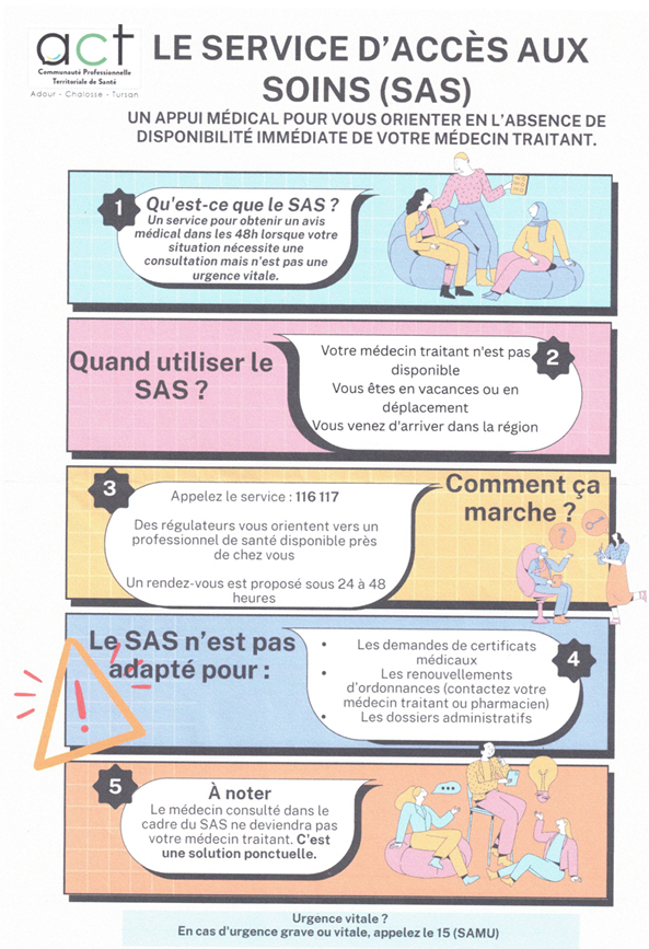 Si la prise en charge des soins non programmés ne peut être assuré par le médecin traitant, les patients peuvent contacter la permanence des soins non programmés au 116 117 ou au 05 58 14 11 11 qui les aidera à trouver un rendez-vous dans les 48 heures avec un médecin généraliste sur le secteur géographique.